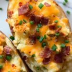 Twice Baked Potatoes are a delicious and comforting side dish featuring crispy baked potato skins filled with a flavorful mixture of mashed potato, crispy bacon, butter, parmesan, and cheddar cheese. Perfect as a make-ahead recipe for family meals or holiday gatherings.