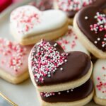 These Valentine Cookies are tender, buttery cutouts dipped in rich dark and white chocolate, decorated with festive nonpareils, perfect for sharing at Valentine’s Day or any special occasion.
