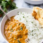 A delicious and comforting Vegan Butter Chicken made with crispy baked tofu simmered in a rich, creamy coconut tomato sauce infused with traditional Indian spices. Perfect served over rice with vegan naan and garnished with fresh cilantro.