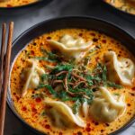 - Serve and Garnish: Ladle hot soup and dumplings into bowls. Top with chili oil, sliced scallion greens, chopped fresh cilantro, and crunchy garlic for added flavor and texture.