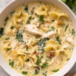 A cozy and hearty White Lasagna Soup featuring tender chicken, sun-dried tomatoes, spinach, and broken lasagna noodles, enriched with a creamy half-and-half broth and topped with a blend of ricotta, Parmesan, and mozzarella cheeses.